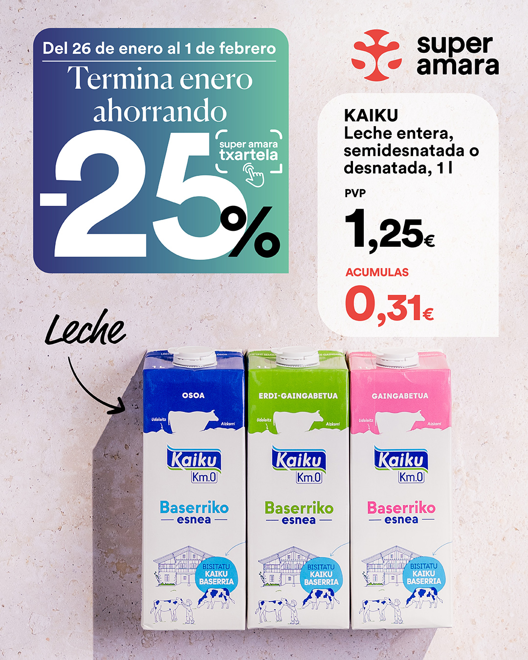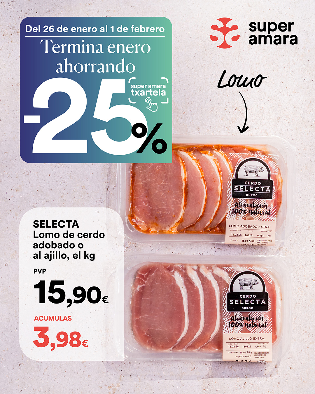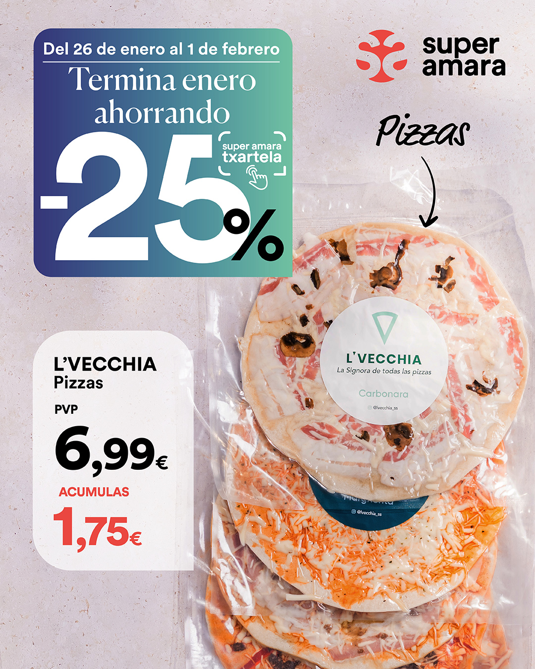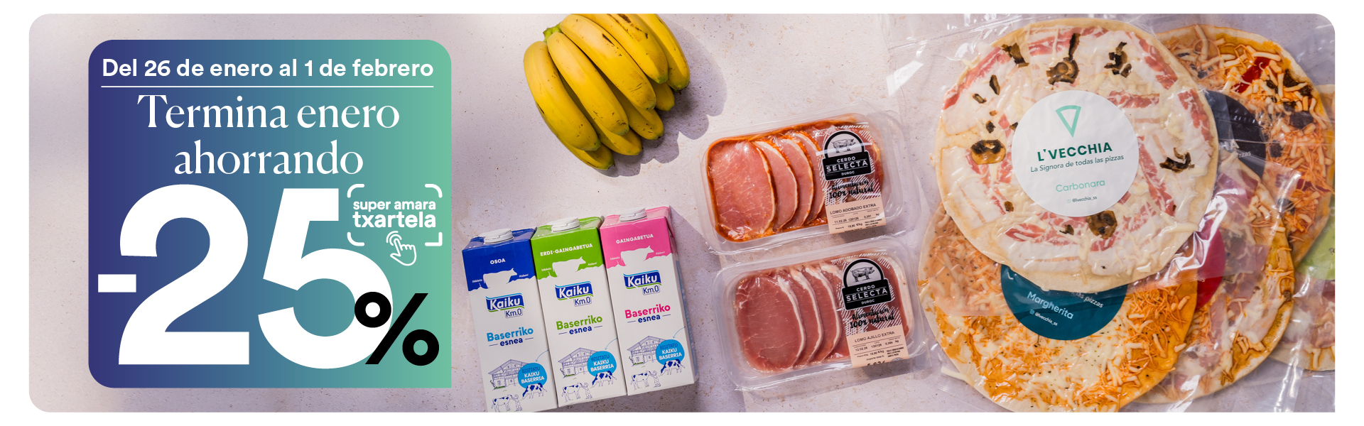 Solo del 26 de enero al 1 de febrero, consigue un vale con el 25% de ahorro comprando tus productos imprescindibles: lecke Kaiku, plátanos, Lomo adobado o al ajillo Selecta, y las mejores pizzas artesanas ¡L’ Vecchia!